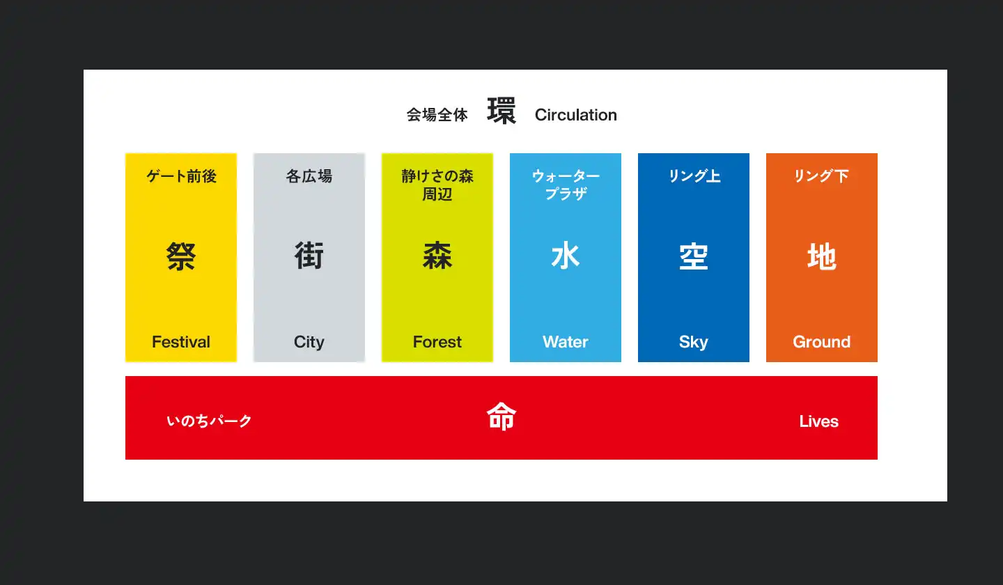 会場デザインプロデューサー 藤本壮介(藤本壮介建築設計事務所) プロデューサー 花岡(人間) クリエイティブディレクター 引地耕太(VISIONs)VISUAL DESIGN